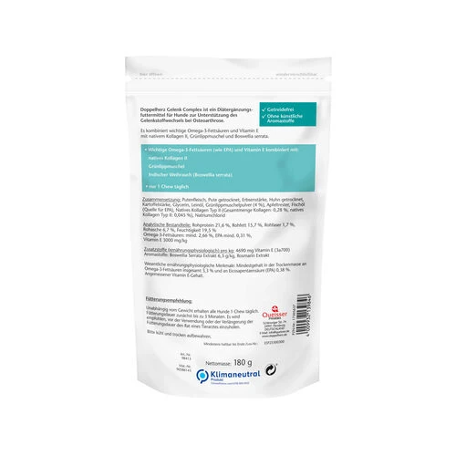 Benötigt Ihr Hund Unterstützung für seine Gelenke? Doppelherz Gelenk Complex für Hunde ist ein innovatives und wirksames Diätergänzungsfuttermittel. Es kombiniert wertvolle, natürliche Inhaltsstoffe zur Unterstützung des Gelenkstoffwechsels bei Osteoarthrose. Mit nativem Kollagen Typ II, Grünlippmuschelpulver und Indischem Weihrauch (Boswellia serrata), kombiniert mit Vitamin E. Die Verabreichung ist einfach, da nur ein leckerer Kausnack pro Tag genügt.