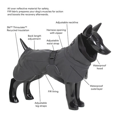 Die PAIKKA Visibility Winterjacke hält Ihren Hund bei unterschiedlichen Wetterbedingungen warm, trocken und sicher. Die Jacke ist aus 100 % wasserabweisendem Material gefertigt und die Nähte sind versiegelt. Darüber hinaus ist die Jacke auch reflektierend, so dass Ihr vierbeiniger Freund auch im Dunkeln gut gesehen werden kann. Die warme Thinsulate-Isolierung besteht zu 78 % aus recycelten Materialien. Das spezielle Ferninfrarot-Futter (FIR) unterstützt die Erholung Ihres vierbeinigen Freundes nach dem Training und kann auch helfen, Verletzungen vorzubeugen. Der Wintermantel ist außerdem an Halsausschnitt, Taille, Rückenlänge und Beinträgern verstellbar. Mit der PAIKKA Visibility Winter Jacket kann Ihr Hund also bequem, trocken und sicher spazieren gehen.